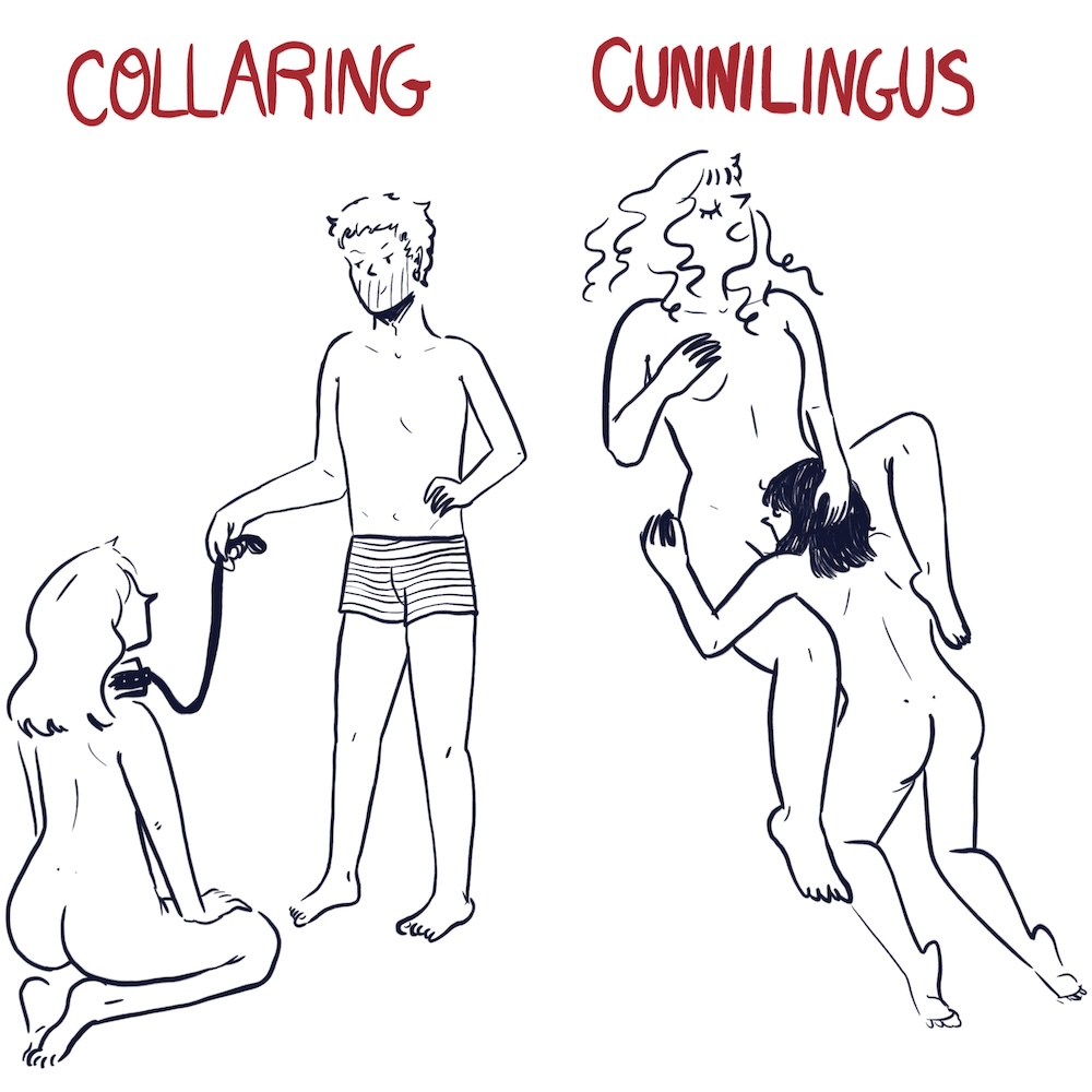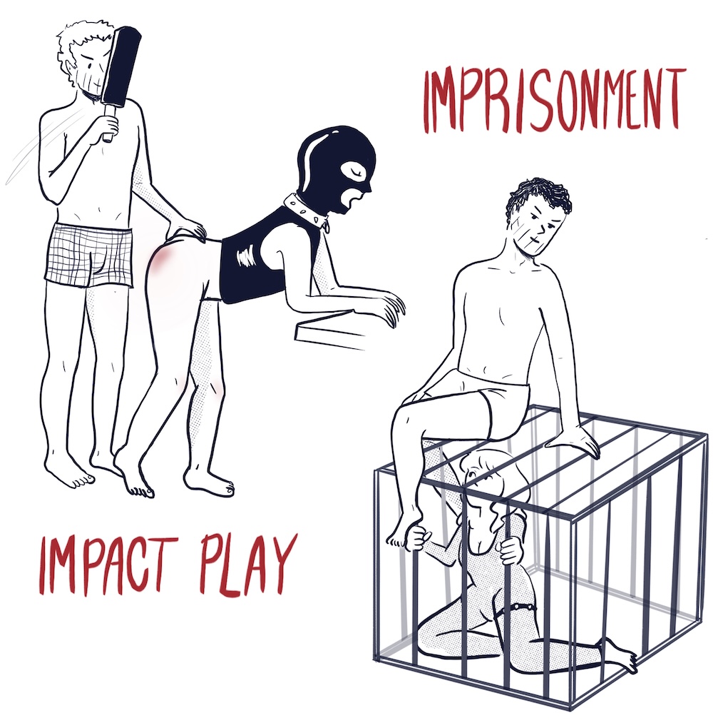 Choking: blood choking is the act of choking someone until they pass out. It is incredibly dangerous (which we wrote about before – check out our guide on choking during sex) and can lead to brain damage. Choking is a type of edge play.